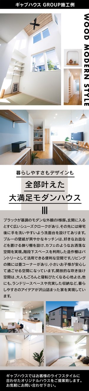 ブラック×モダンな外観が魅力のI様邸。帰宅動線が整う玄関と爽やかなブルーのキッチン、畳コーナーや吹き抜けなど心地よさが充実。造作棚やパントリー、ランドリーなど収納も多く、暮らしやすさを叶えた住まいです。