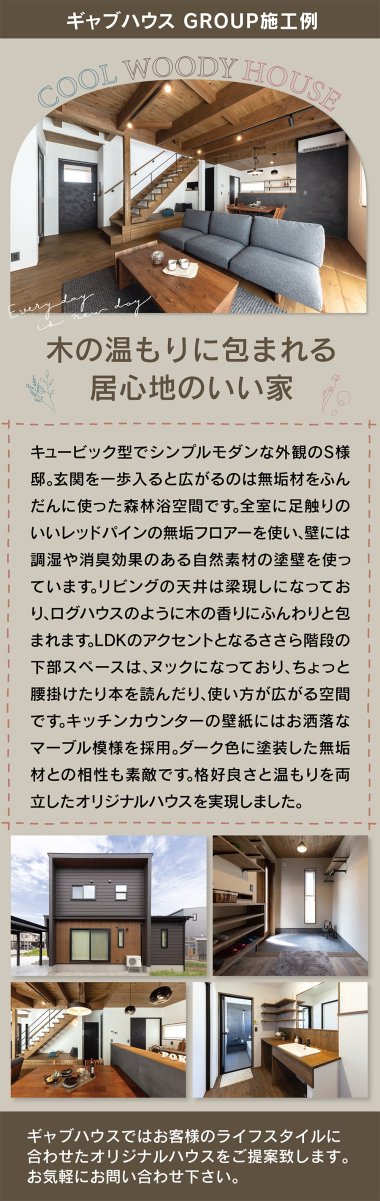 キューブ型のシンプルモダンなS様邸。無垢材と塗壁が生む森林浴のような癒し空間。梁現し天井やヌックなど木の温もりとデザイン性を両立した心地よい住まいです。
