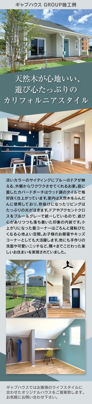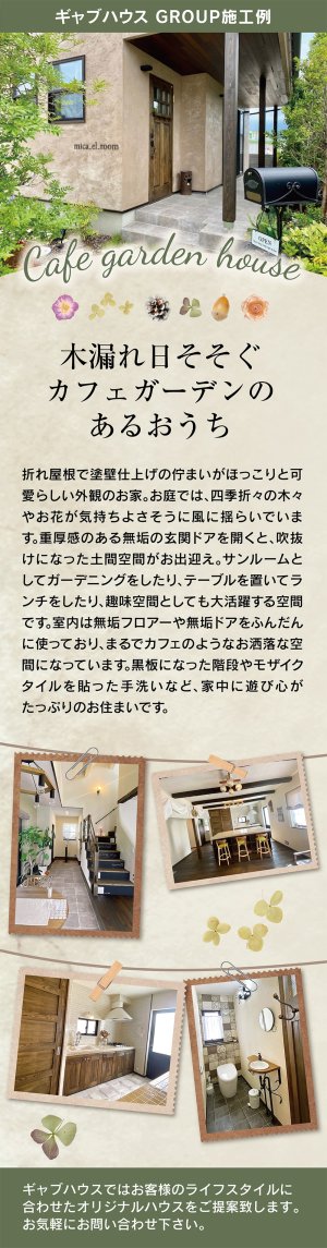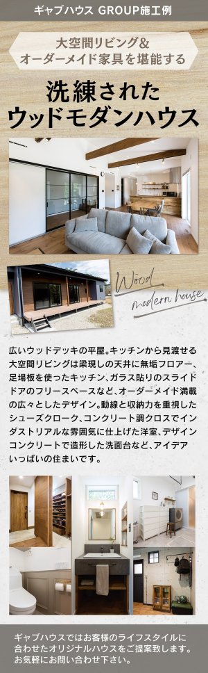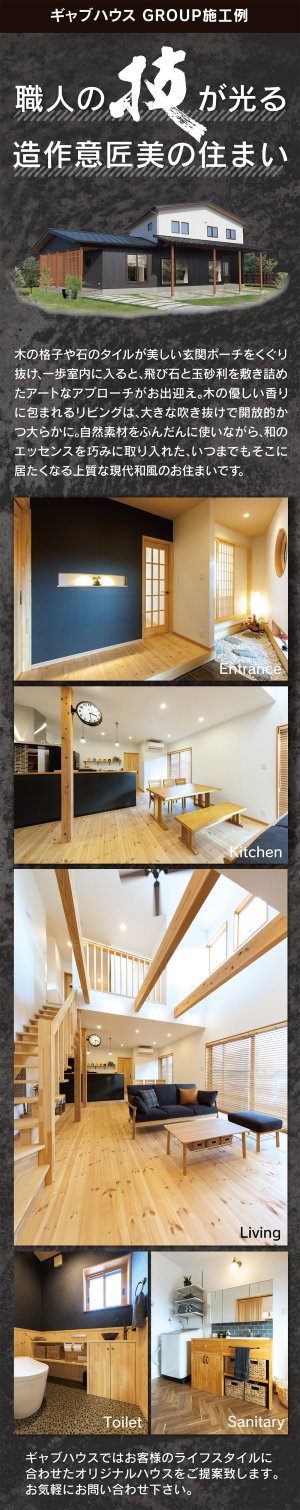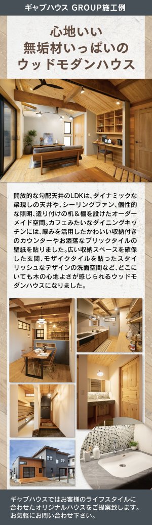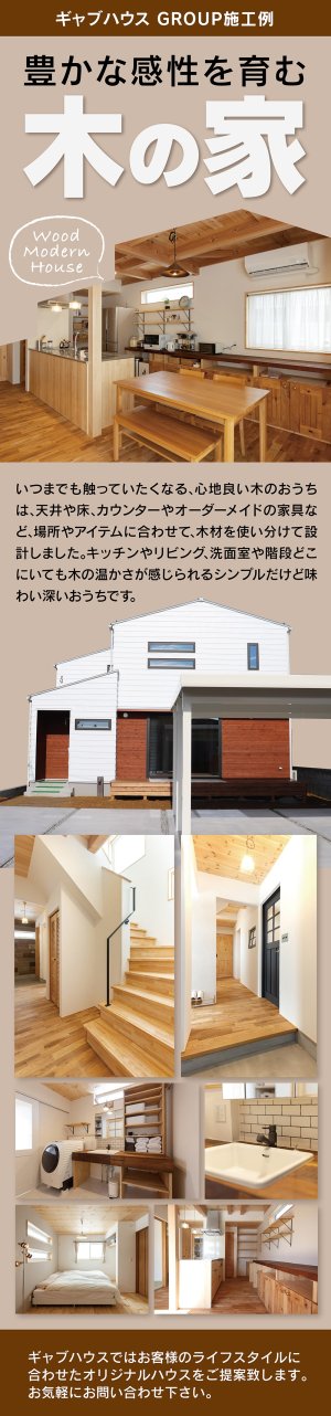 自然素材をなるべく使ったオーダーメイドの家づくりを心掛けています。光熱費を抑える為に断熱性能にもこだわっています。本物の素材で手づくりのキッチン・造作洗面など、オリジナルの空間もご提供しています。新築(注文住宅)・リフォーム・リノベーションのことは、お気軽にご相談下さい。広島県で住宅を建てるなら、広島県東広島市のギャブハウス東広島にお任せ下さい。